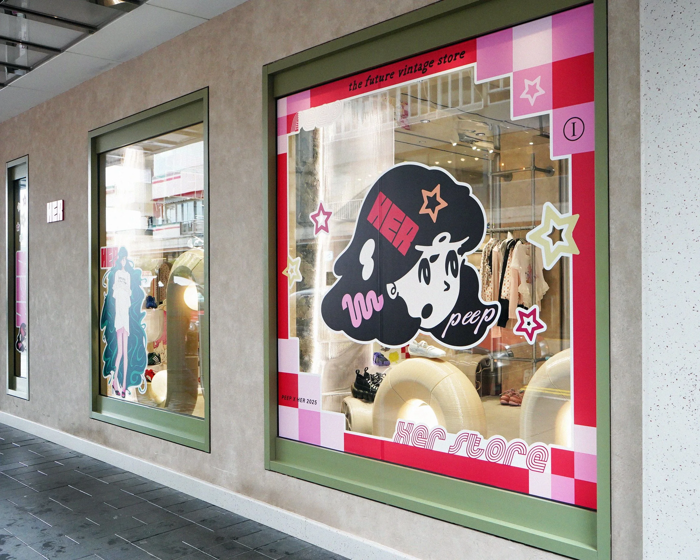 This marks my 3rd collab with HER. I believe that our collaboration with HER this time was really different from our previous collaborations. It was my first experience combining modern and antique styles to create an exhibition, and while it was difficult, I found it to be really interesting and fulfilling. Having never considered this idea before, I tried to collect vintage items, paint them pink, and hang her clothes in a vintage way.